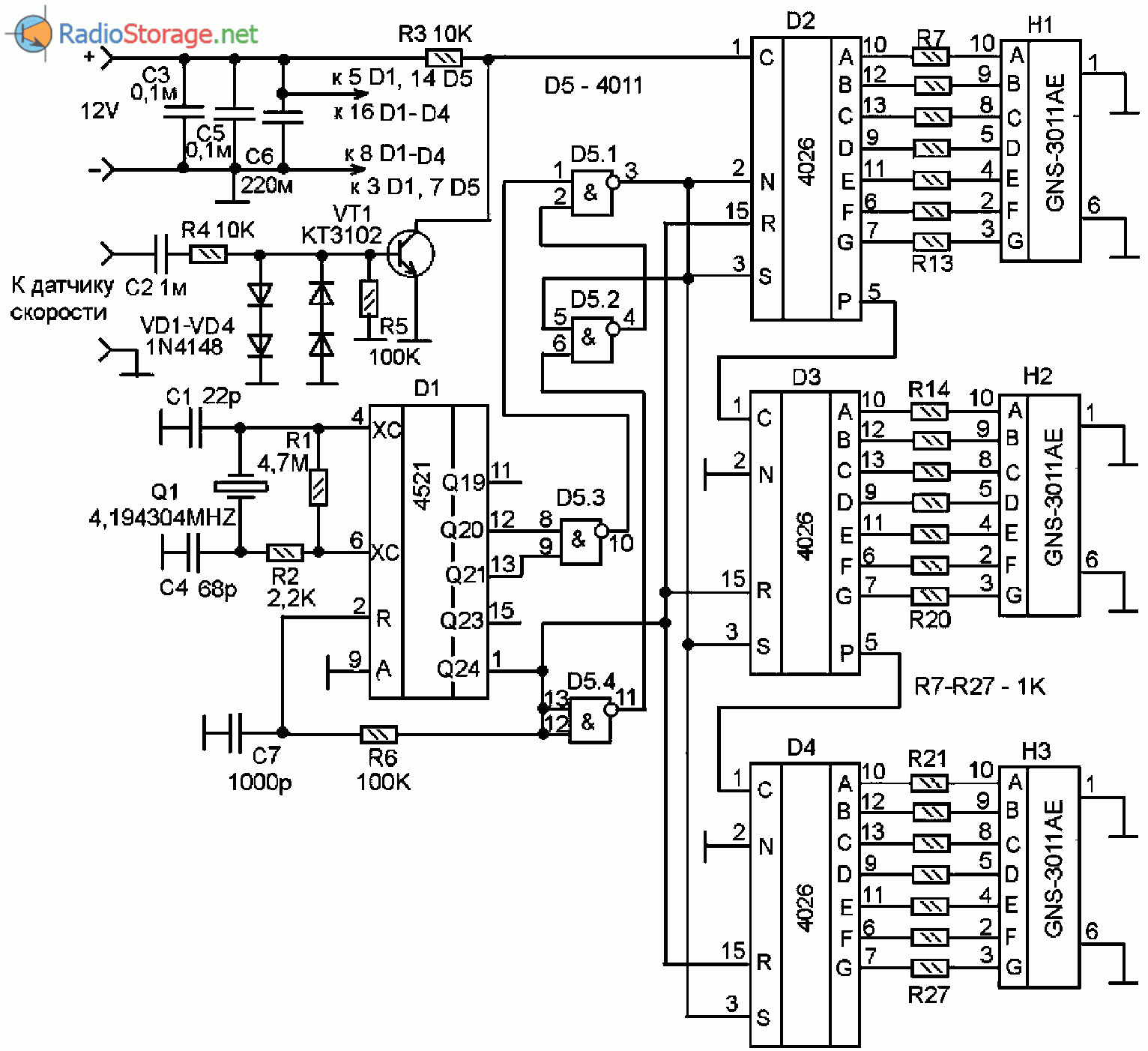 Питание схемы цифрового автомобильного спидометра осуществляется непосредственно от клеммы замка зажигания. Схема индикации построена так, что незначащие нули гаснут. С схеме применен звукоизлучатель с встроенным генератором, имеющий частоту звучания в районе 1400 Гц. и рассчитанный на работу от 5 вольт.