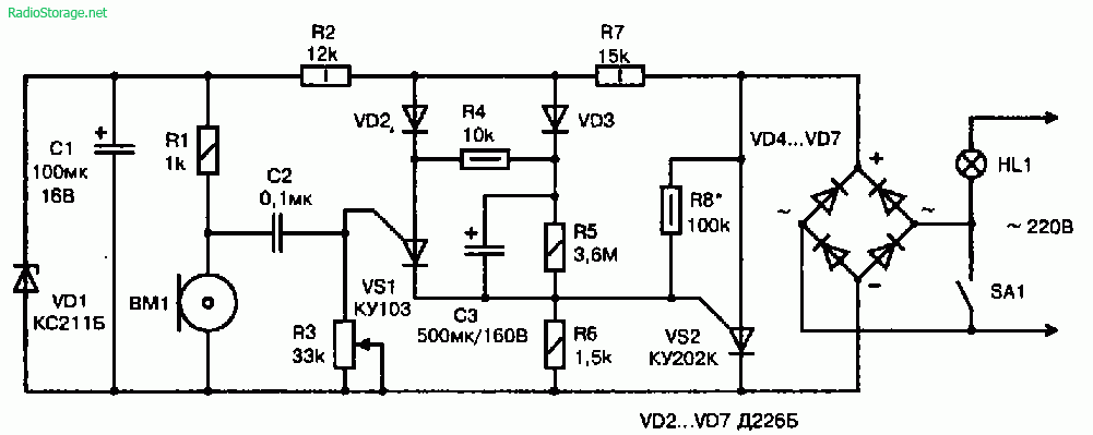 Схема выключателя освещения управляемого звуком (питание 220В)