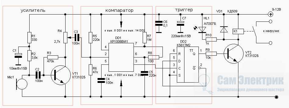 Для удобства изучения схемы мы выделили на ней основные узлы: усилитель микрофона на транзисторе КТ3102, компаратор на микросхеме ne555, триггер ТМ561 и транзистор КТ3102, который управляет силовым реле.