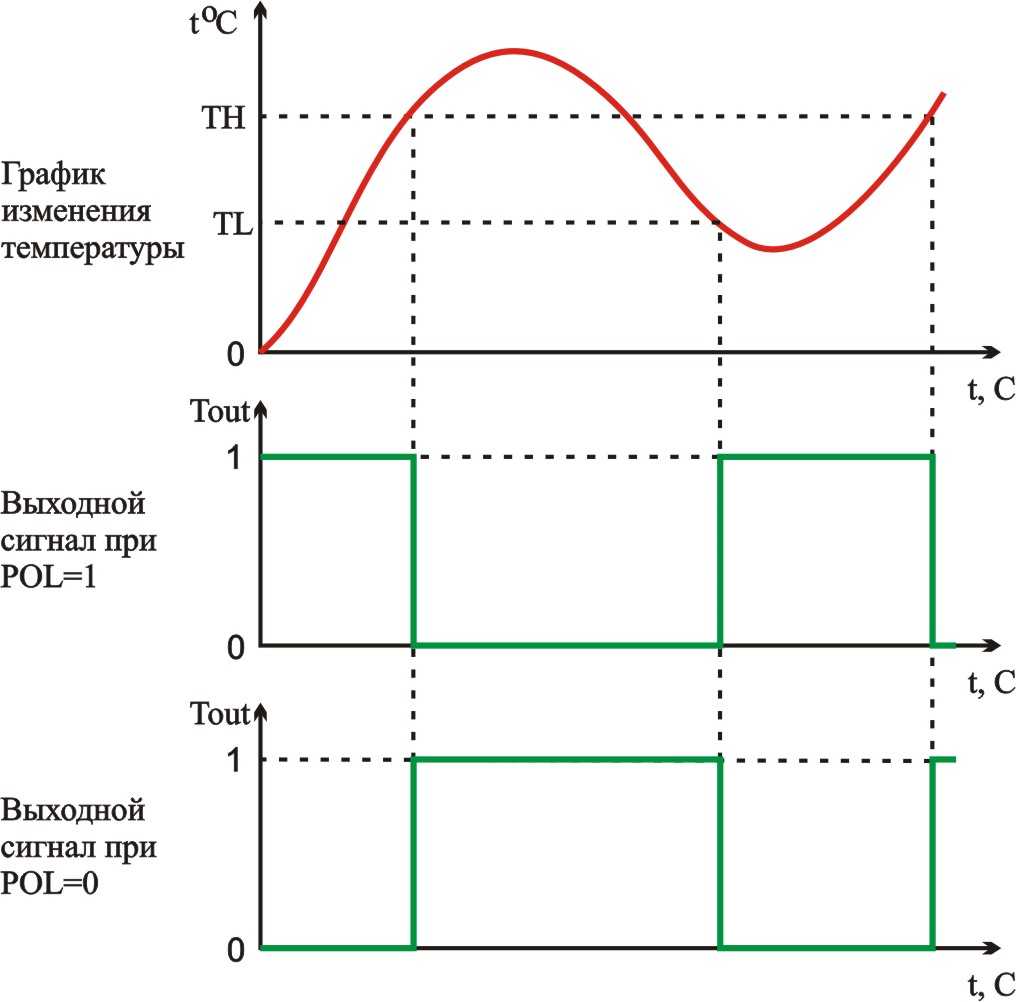 Микросхема DS1621 может работать в режиме термостата. Для этого имеется выход Tout, устанавливаемый в зависимости от значения температуры. Пороги включения и выключения выхода задаются значениями в регистрах TH и TL. Полярность выхода устанавливается битом POL регистра конфигурации.