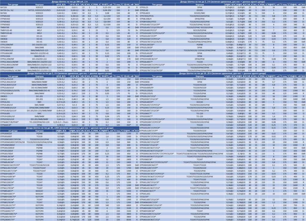 При прямом смещении разность потенциалов на диоде Шоттки не превышает 0,5 В, тогда как на обычном выпрямительном вентиле падение напряжения составляет около 2-3 В. Это объясняется небольшим сопротивлением переходного участка между полупроводником и металлом. В таблице ниже представлены характеристики диодов Шоттки.