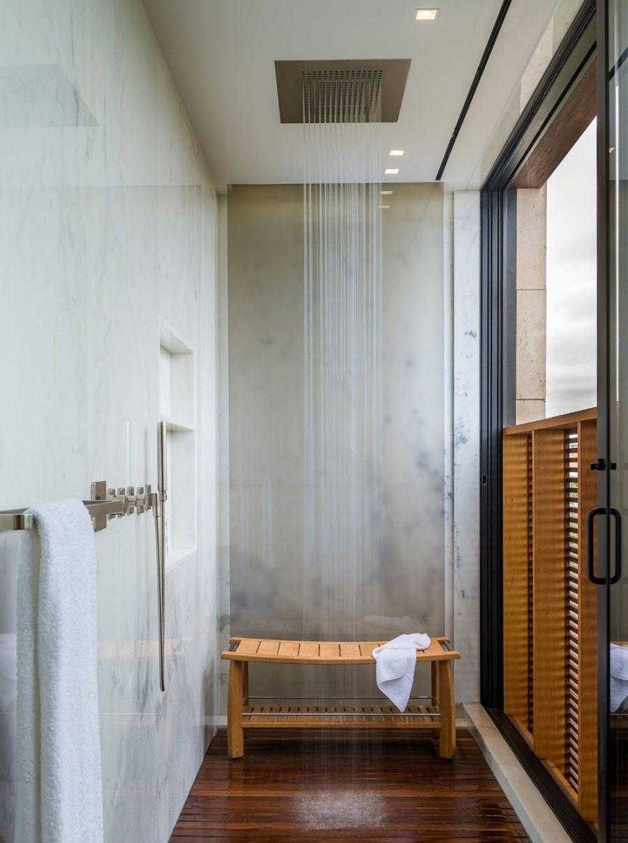 Также важно учесть, что установка душа без душевой кабины имеет определенные требования к покрытию стен и пола. Стены обычно оформляют мозаикой, сланцем, песчаником, гранитом или мрамором