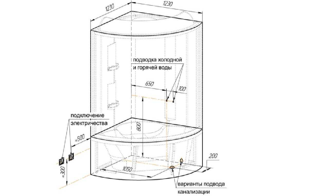 Следует отметить, что технология монтажа разных кабин может отличаться. Например, достаточно часто отличаются точки подключения водопровода и канализации. Поэтому перед началом работ желательно тщательно изучить техническую документацию к приобретенной модели.