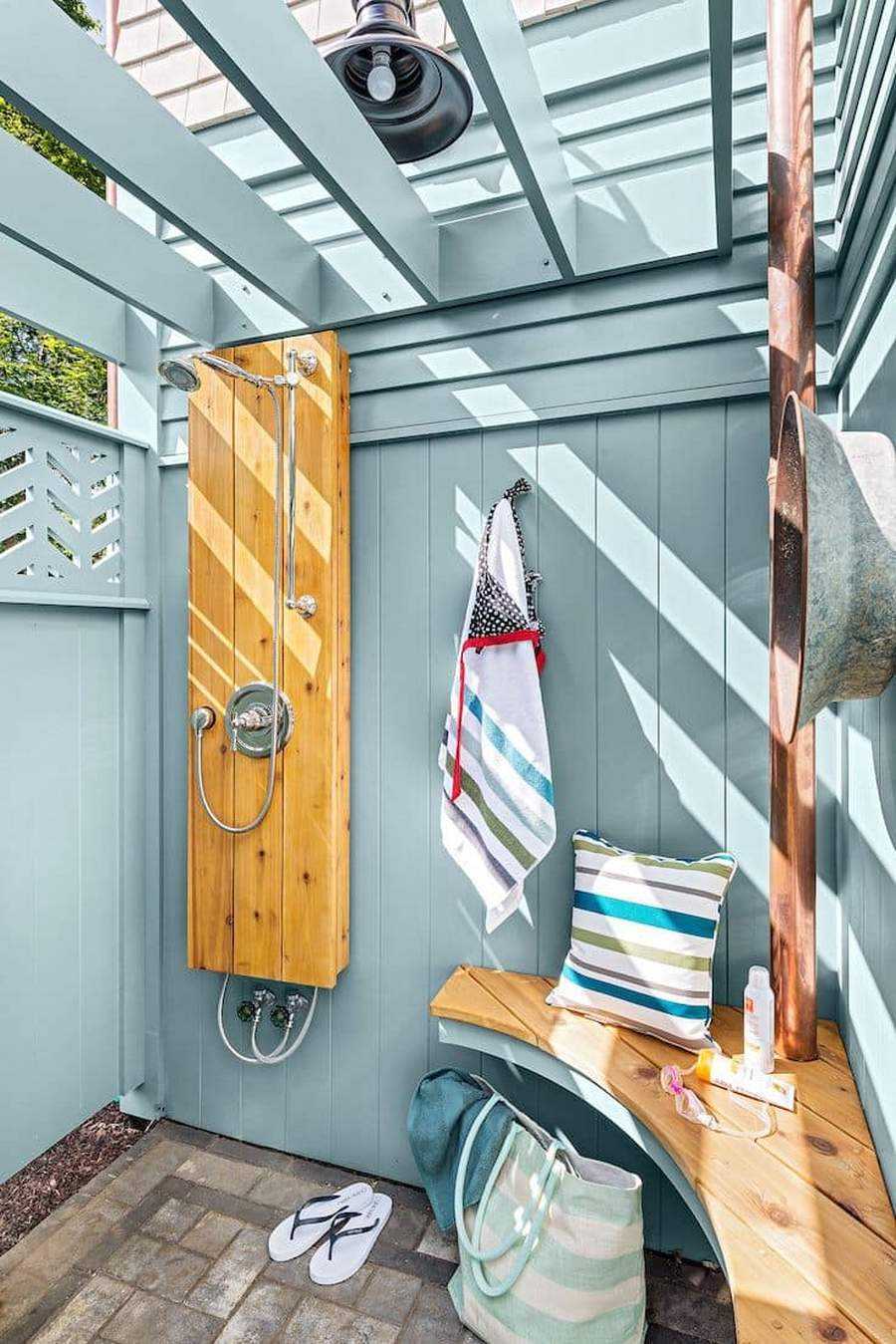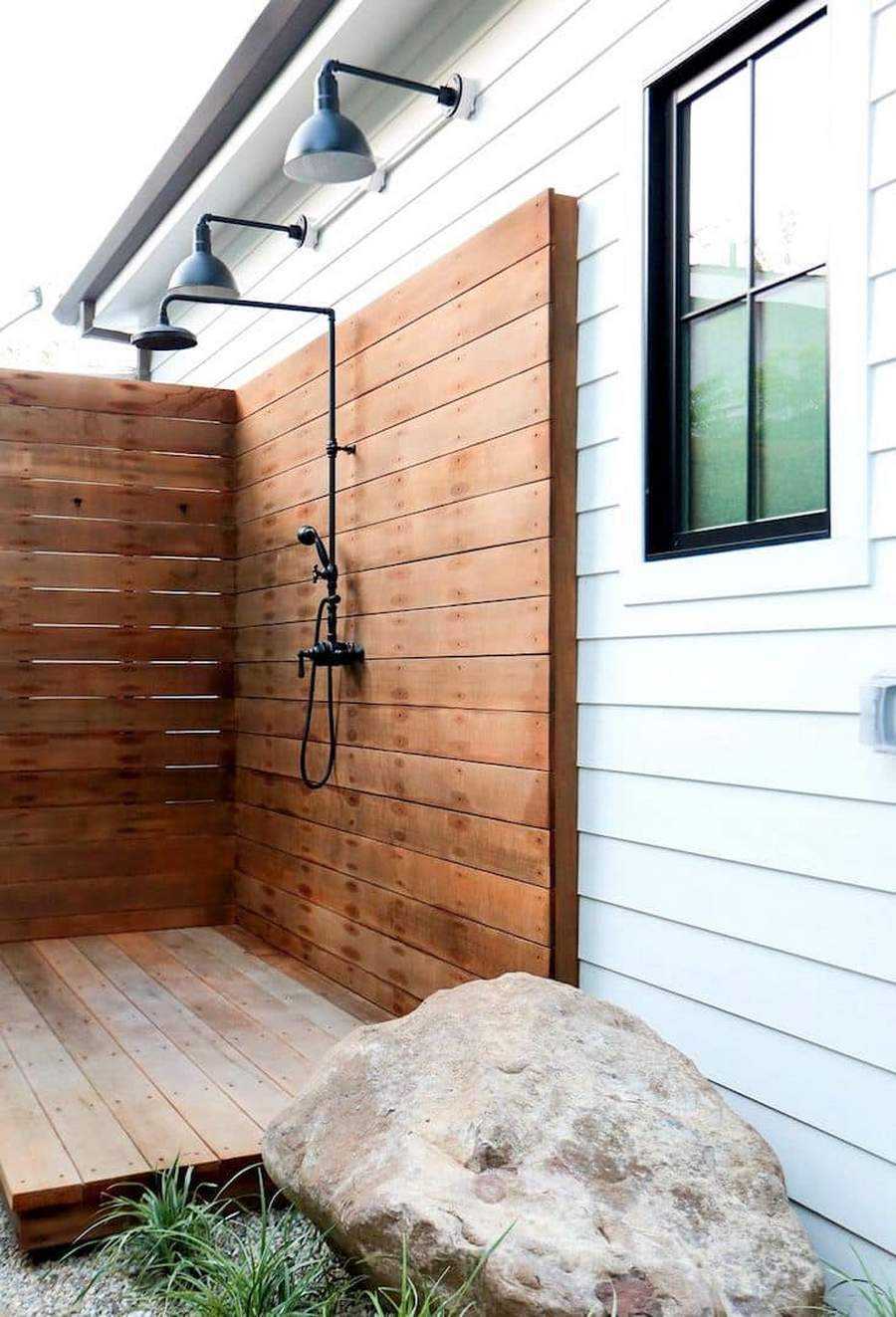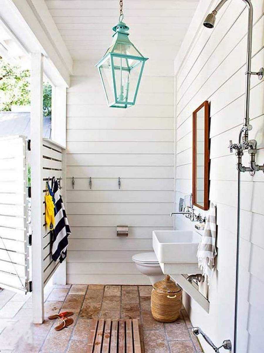 Белый цвет стен поможет визуально увеличить пространство, а хорошее освещение — позволит с комфортом принимать душ даже после захода солнца