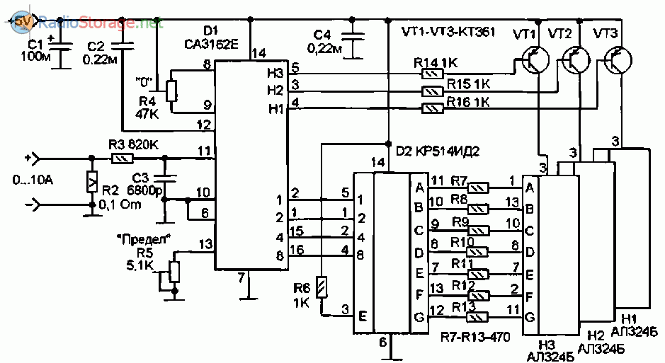 Рис. 2. Принципиальная схема цифрового амперметра до 10А и более на микросхемах СА3162, КР514ИД2.