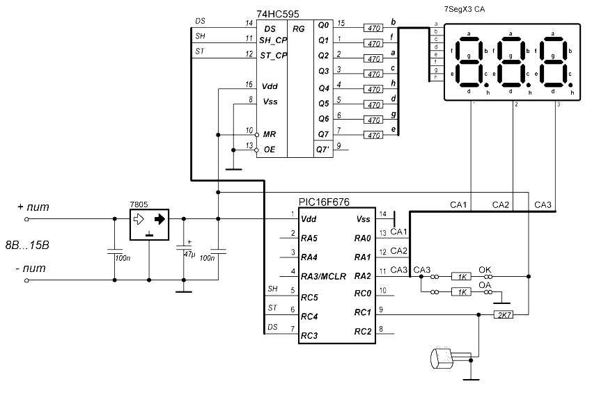 В схеме, для индикации показаний, применен семисегментный трехразрядный светодиодный индикатор (описание и подключение семисегментных индикаторов к микроконтроллеру).