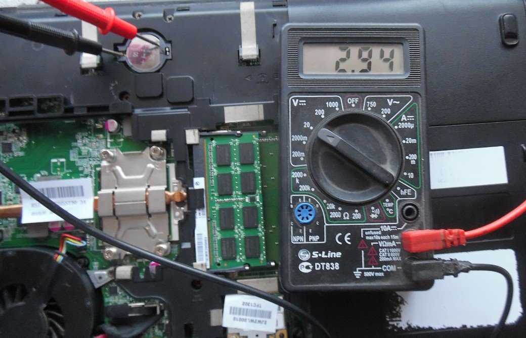 Для выполнения проверки элемента питания потребуется мультиметр. Это прибор для измерения сопротивления, напряжения, силы тока, целостности цепи, емкости и другого. Чтобы понять будет ли работать материнская плата от источника питания просто замерьте его напряжение. Если оно будет равно 2,5 вольта, то источник энергии лучше заменить.
