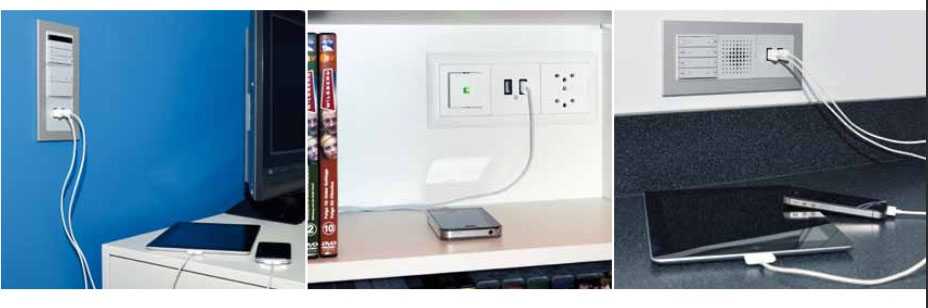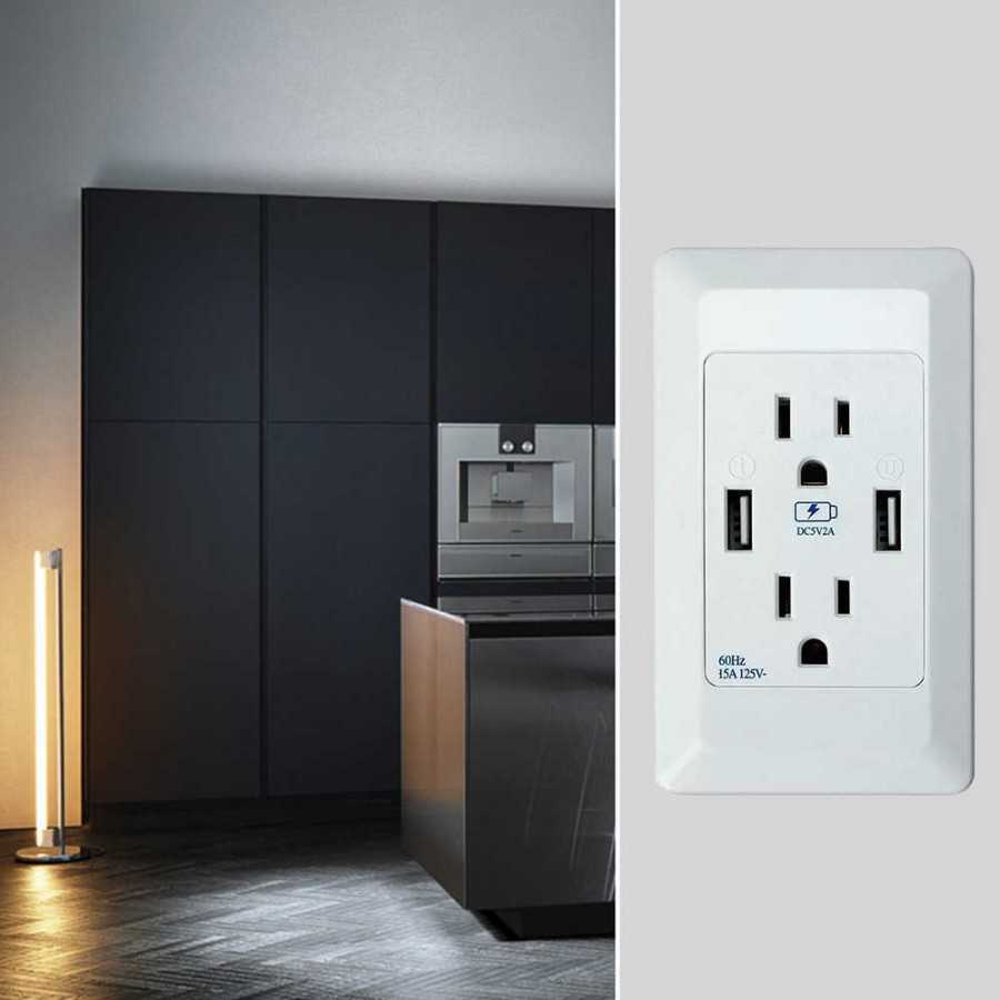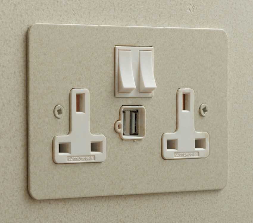 Встроенная розетка с USB: встраиваемые USB розетки представляют собой единый блок, внутри которого расположен блок питания и от одного до четырех USB разъёмов, расположенных на лицевой панели. Визуально он практически не отличим от обычной силовой встраиваемой розетки.
