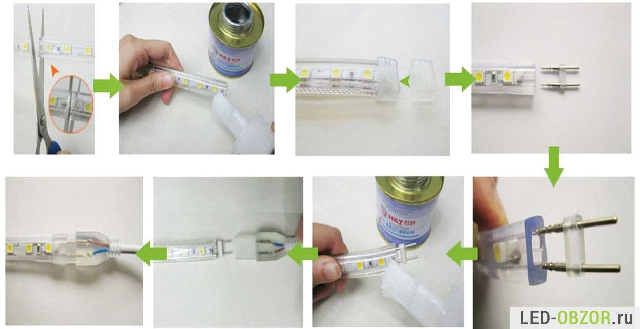 В случае резки ленты 12 или 24в, ее потребуется паять, то есть самостоятельно присоединить провода своими руками.