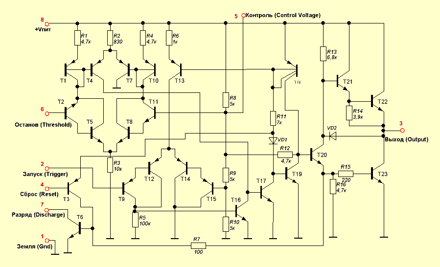 - Вывод 7 (разряд). Он подсоединяется к транзисторному коллектору Т6, а эмиттер последнего заземлен. При открытом транзисторе конденсатор разряжается до его закрытия.
