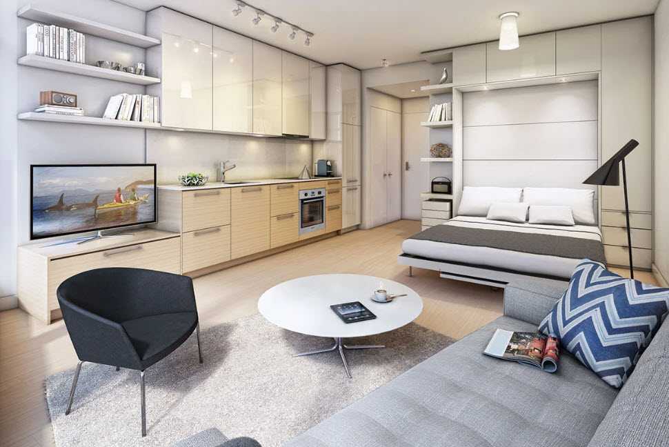 Существуют дизайнерские проекты, в которых удается не совмещать кухню с жилой комнатой. В такой функциональной комнате отлично соседствуют гостиная, спальня и рабочая зона. Кровать лучше выбрать откидную, которая прячется днем в шкаф, а диван раскладывающийся. Это помогает здорово сэкономить место. Оптически вытянуть и расширить пространство помогут зеркала на стенах и шкафах, а также обои в вертикальную полоску.