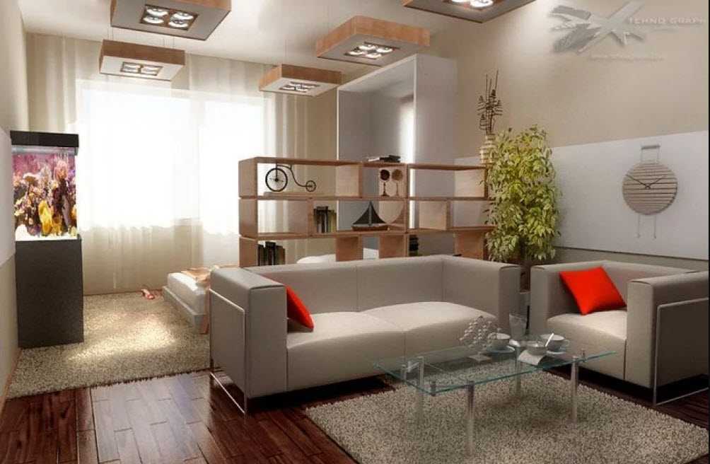 15 кв. м. В маленькой комнате можно разместить и зал, и спальную зону. Двуспальную кровать удастся отделить от дивана красивой гипсокартонной перегородкой с открытой центральной частью, украшенной стеклянными подвесками. Это эффектный вариант зонирования, при котором и отделочные материалы, и цветовые решения всех зон могут оставаться одинаковыми.