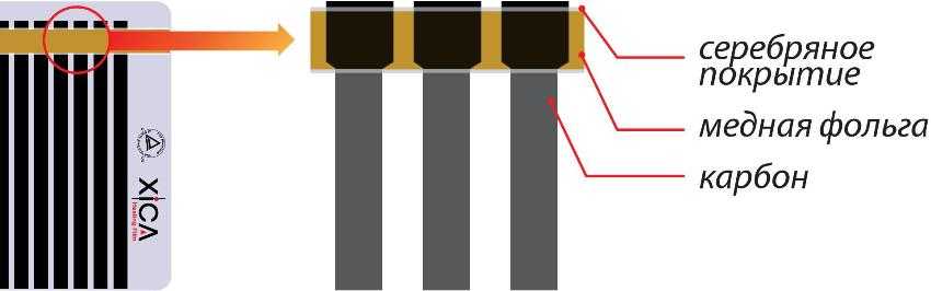 Инфракрасный пленочный теплый пол состоит из следующих элементов. Полосы углеродного материала шириной около 1,5 см соединены между собой при помощи медных шин с серебряным покрытием, которые и проводят электрический ток. Нагревательный элемент заламинирован с двух сторон плотным полимером, который не задерживает инфракрасное излучение и обеспечивает отличную защиту от попадания влаги, пробоев и возгорания.