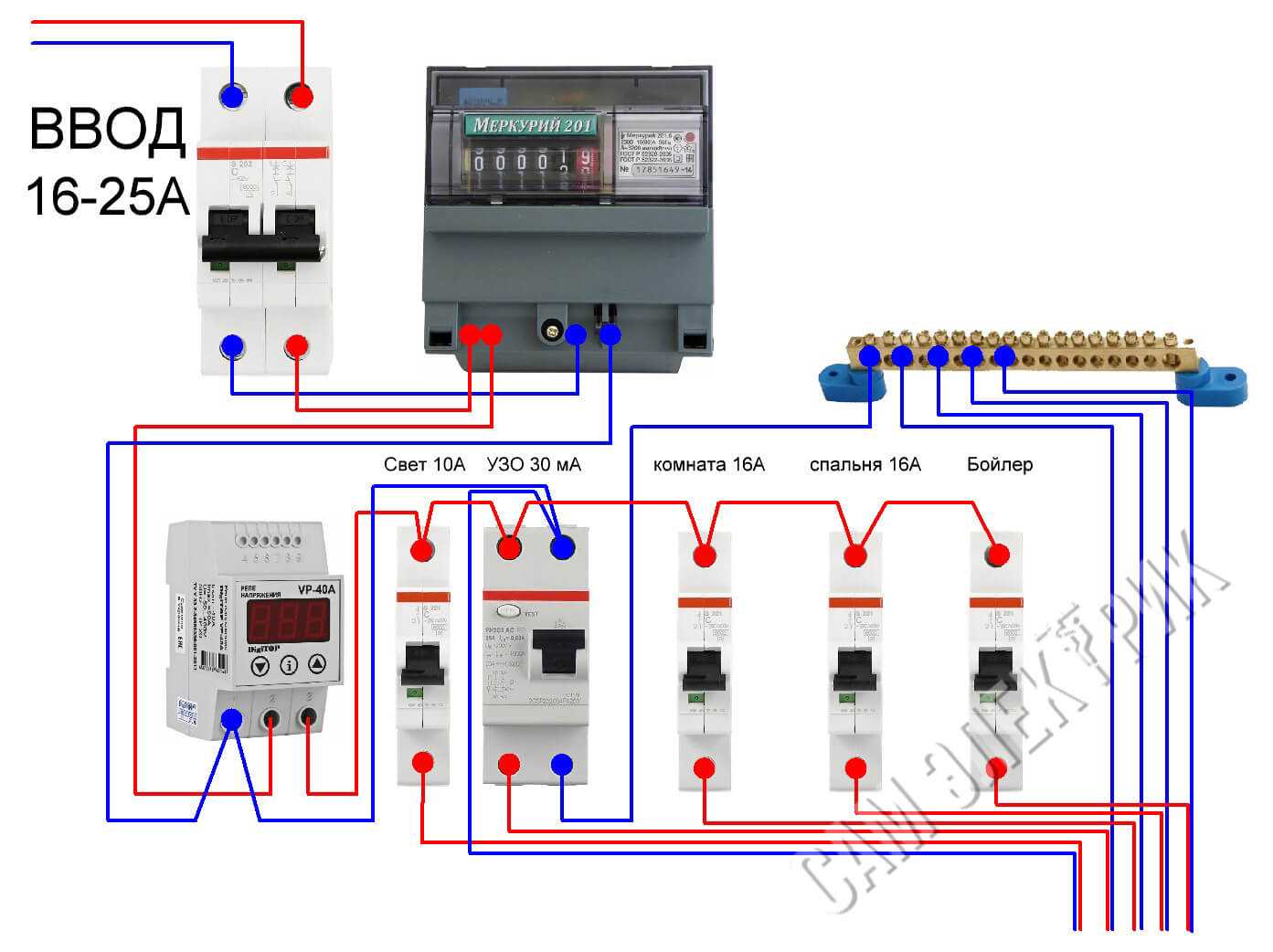 Схема простого щитка без заземления с однофазным вводом 220В: