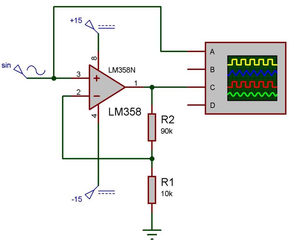Это также можно легко проверить с помощью программы Proteus. Схема будет выглядеть вот так: