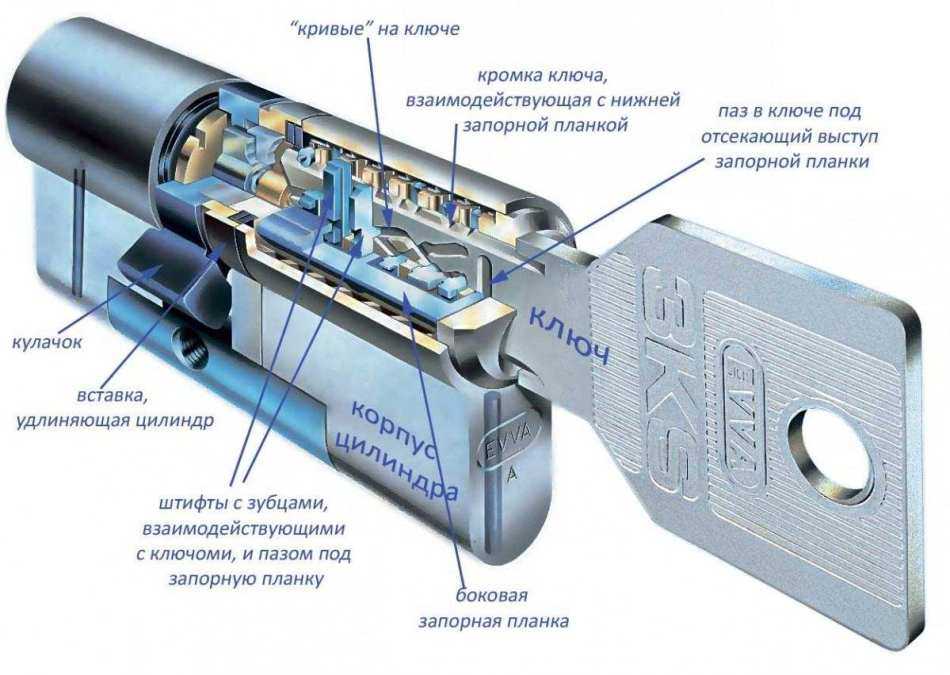 Из-за этого ключ имеет большую длину, включает косые прорези. На пластинах наличествуют ответные прорези. При совпадении задвижки отодвигаются и створка открывается.