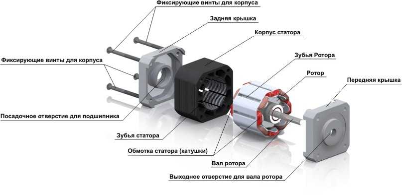 Электродвигатель (или электромотор) состоит из двух основных частей: из статора, часто неподвижной части и из ротора (или якоря) — подвижной вращающейся части. Электродвигатели бывают разных типов и конструкций. Каждый тип электродвигателя имеет свои особенности и, соответственно, эксплуатационные характеристики, которые определяют применение электродвигателя на практике.