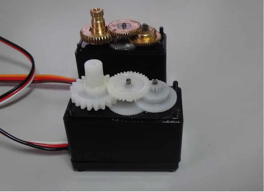 У большинства сервоприводов связующим звеном между валом и внешними элементами является шестеренка, поэтому очень важно, из какого материала она сделана. Наиболее доступных вариантов два: металлические или пластмассовые шестерни