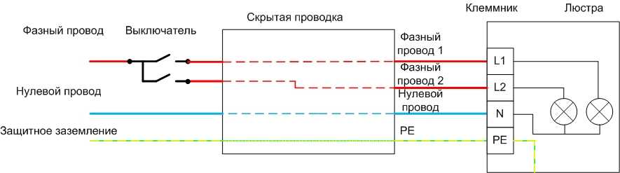 В современных люстрах помимо проводов электрической схемы присутствует защитный заземляющий проводник желто-зеленого цвета, который соединяют с металлической частью корпуса люстры. Этот проводник предназначен для защиты человека от действия электрического тока, который в случае аварийной ситуации может оказаться на металлических частях осветительных приборов.