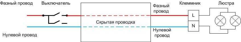 Способ подключения довольно простой, даже в том случае, если в люстре не одна и не две лампочки. Намного проще это сделать, если из люстры выходят провода двух цветов. В таком случае, скручиваются вместе провода одного цвета, сформировав таким образом 2-х проводниковую линию. На рисунке ниже показана схема включения люстры к одинарному выключателю.