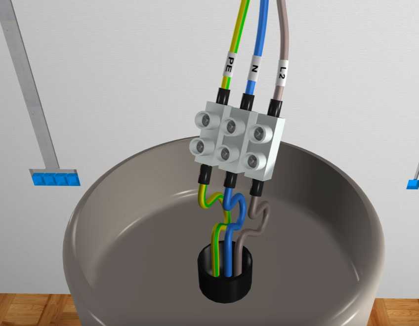 - Заземляющий проводник подключается к такому же проводнику на потолке.