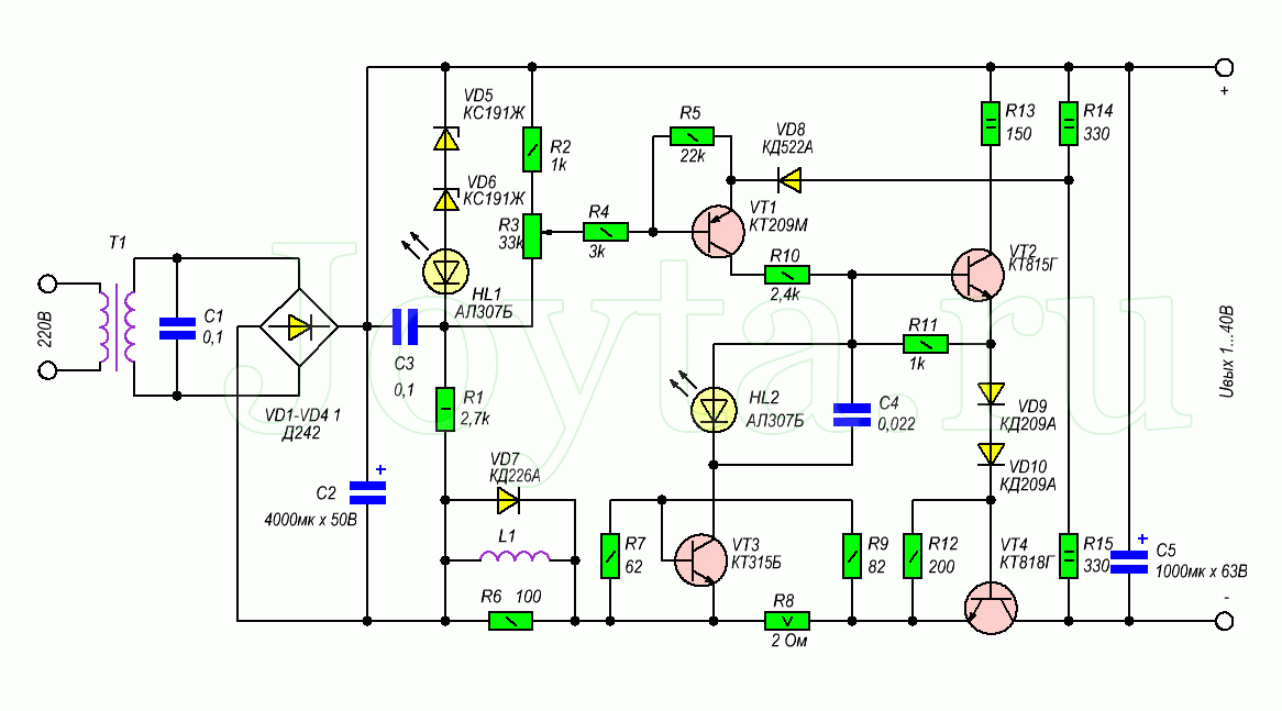 Однополярный БП с возможностью регулировать выходное напряжение можно собрать по схеме, в которую входят: