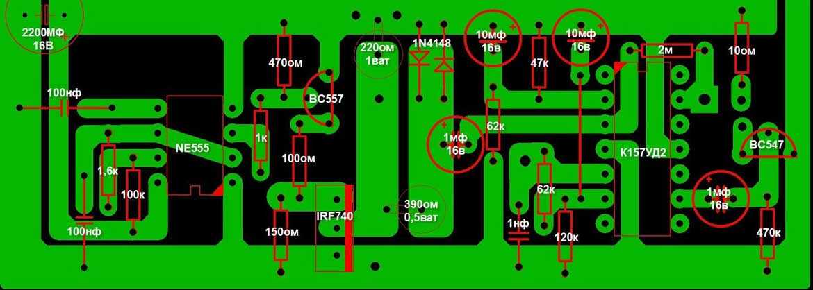 Самой сложной частью устройства является, конечно же, электроника, поэтому с нее и целесообразно начать. В первую очередь нужно сделать печатную плату. Всего есть несколько вариантов плат, в зависимости от используемых радиоэлементов. Есть плата для NE555, а есть плата на транзисторах. Все необходимые файлы для создания платы есть к статье. Также в интернете можно найти и другие варианты плат.