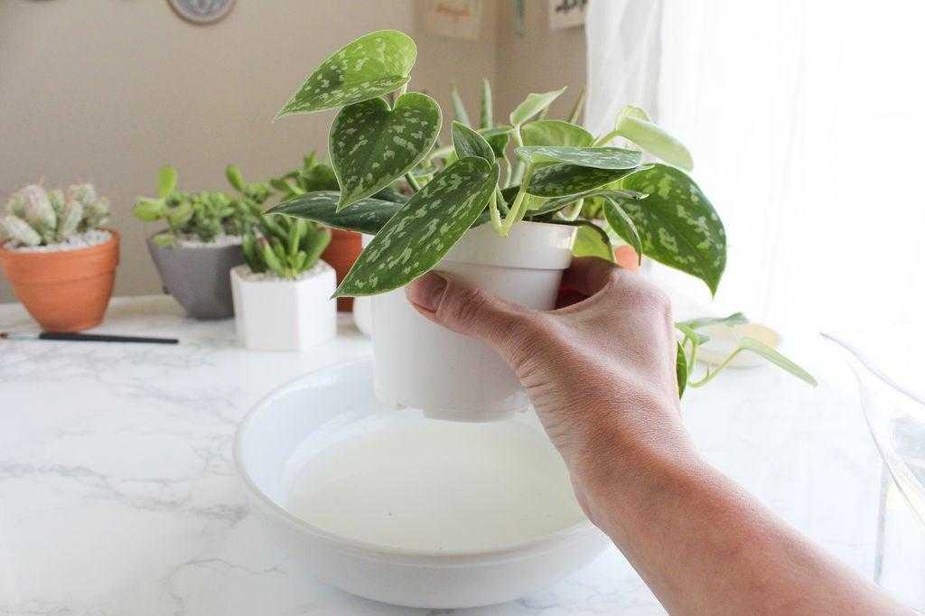 В большую емкость надо налить теплую воду, в нее погрузить горшок с растением до половины высоты и оставить на 15-30 минут. Когда из горшка перестанут выходить воздушные пузырьки, его нужно извлечь и поставить в поддон. Как только грунт отдаст лишнюю влагу, ее необходимо слить из поддона.