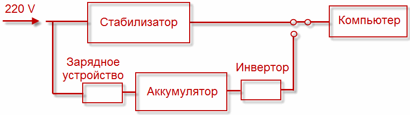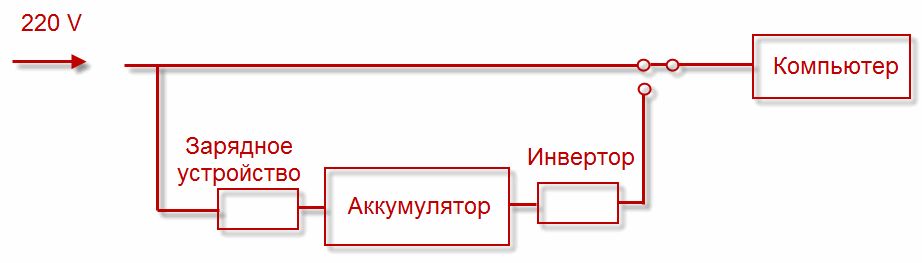 Так же может называться Off-Line или Standby. Самый простой в изготовлении. Благодаря этому самый дешевый. Состоит из аккумулятора, зарядного устройства его питающего, инвертора и реле.