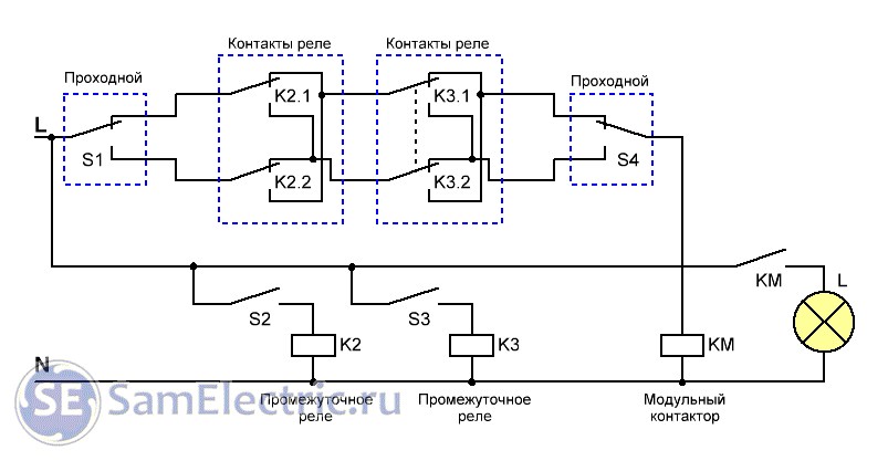 Схема на 2 проходных переключателях 2 реле и модульном контакторе