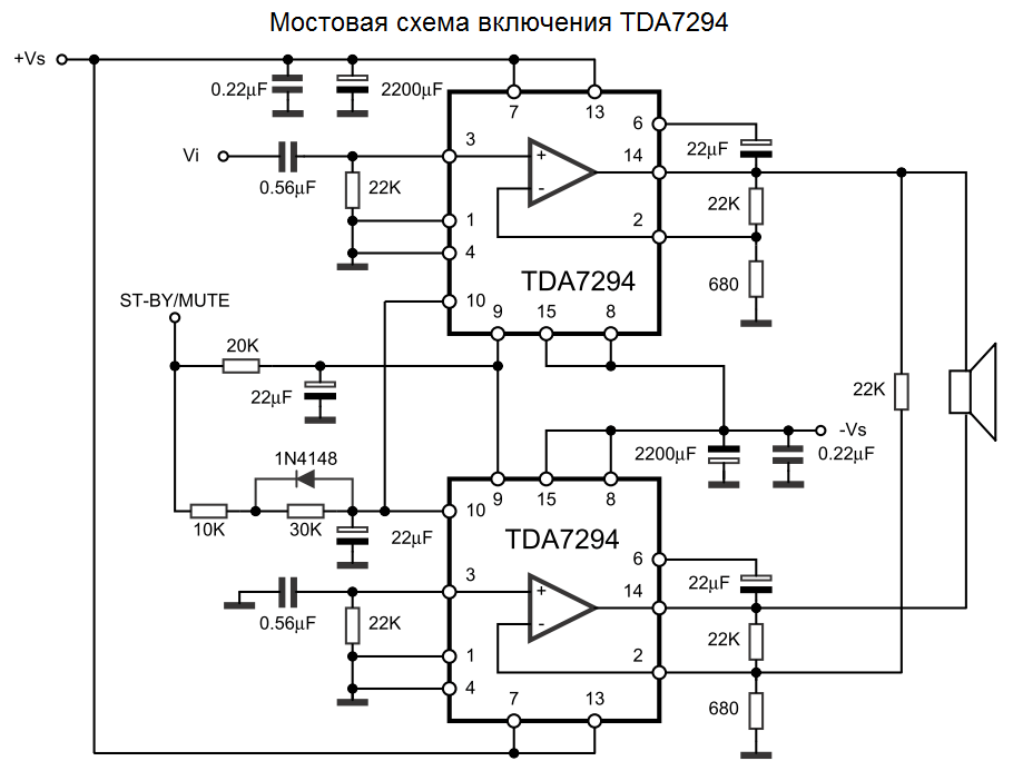 Мостовая схема позволяет добиться до 120 Вт на выходе. Для её реализации потребуется две микросхемы и только в случаях, когда нагрузка составляет 8 или 16 Ом. При меньшем сопротивлении, из-за больших токов, TDA может перегреться и выйти из строя. Она представляет собой конструктивное решение из двух типовых, рассмотренных выше. При этом, громкоговоритель подключен между выходами (контакт 14) микросхем. Оптимальное питающее напряжение для такой сборки не менее 35 В. Вход одного из усилителей (контакт 3) должен быть подключен к земле.