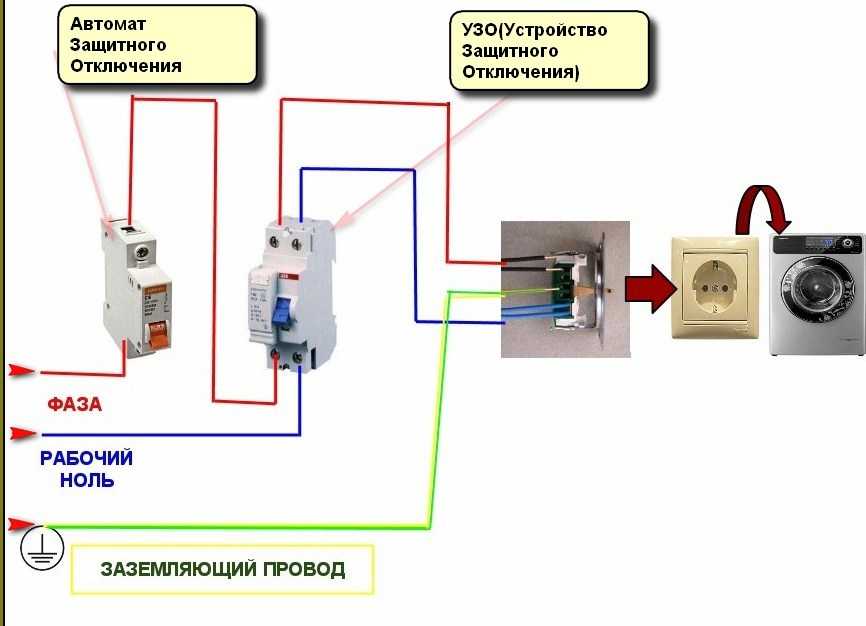 Как было сказано, электрооборудование в этом помещении подключают через УЗО. В идеальном случае будет хорошо, если все розетки и приборы будут подключены через отдельный автомат, но это не всегда возможно сделать без капитальных вложений и без штробления. Схема подключения изображена ниже.