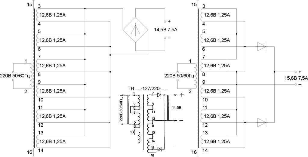 Типовые схемы соединения обмоток ТП и ТПП на 12,6 В под выпрямление мостом или двухполупериодное со средней точкой даны на рис. слева и справа:
