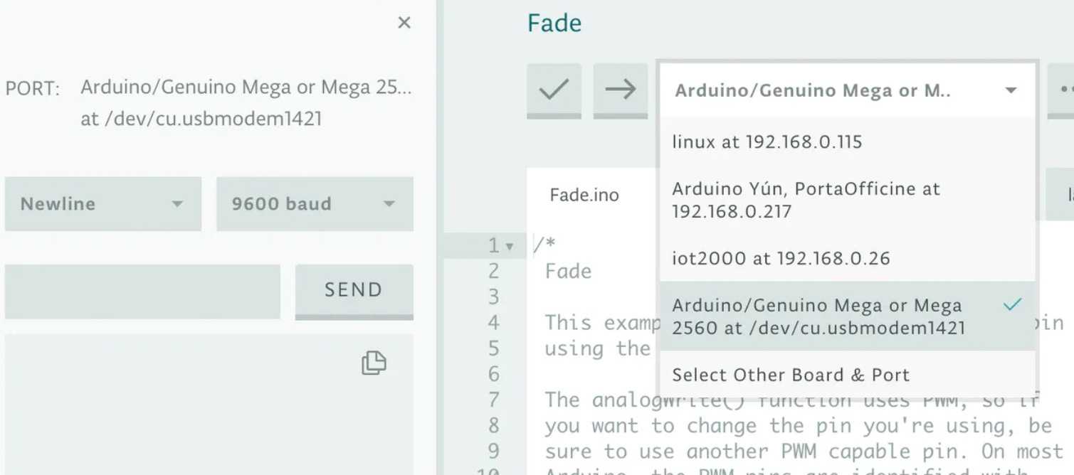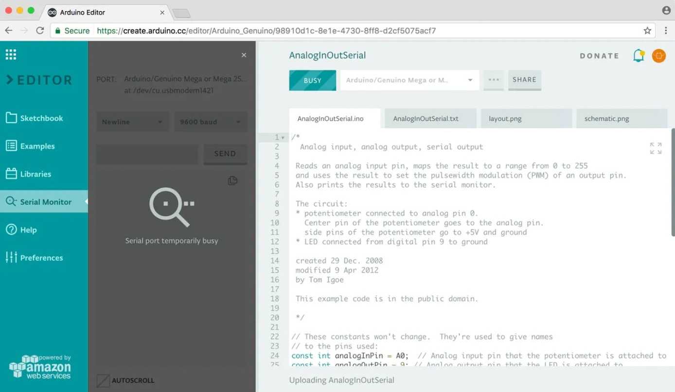 Если хотите протестировать работу монитора последовательной связи, можете открыть пример Examples > 03.Analog > AnalogInOutSerial. Загрузите код этого примера в плату и после этого вы увидите результат его работы.