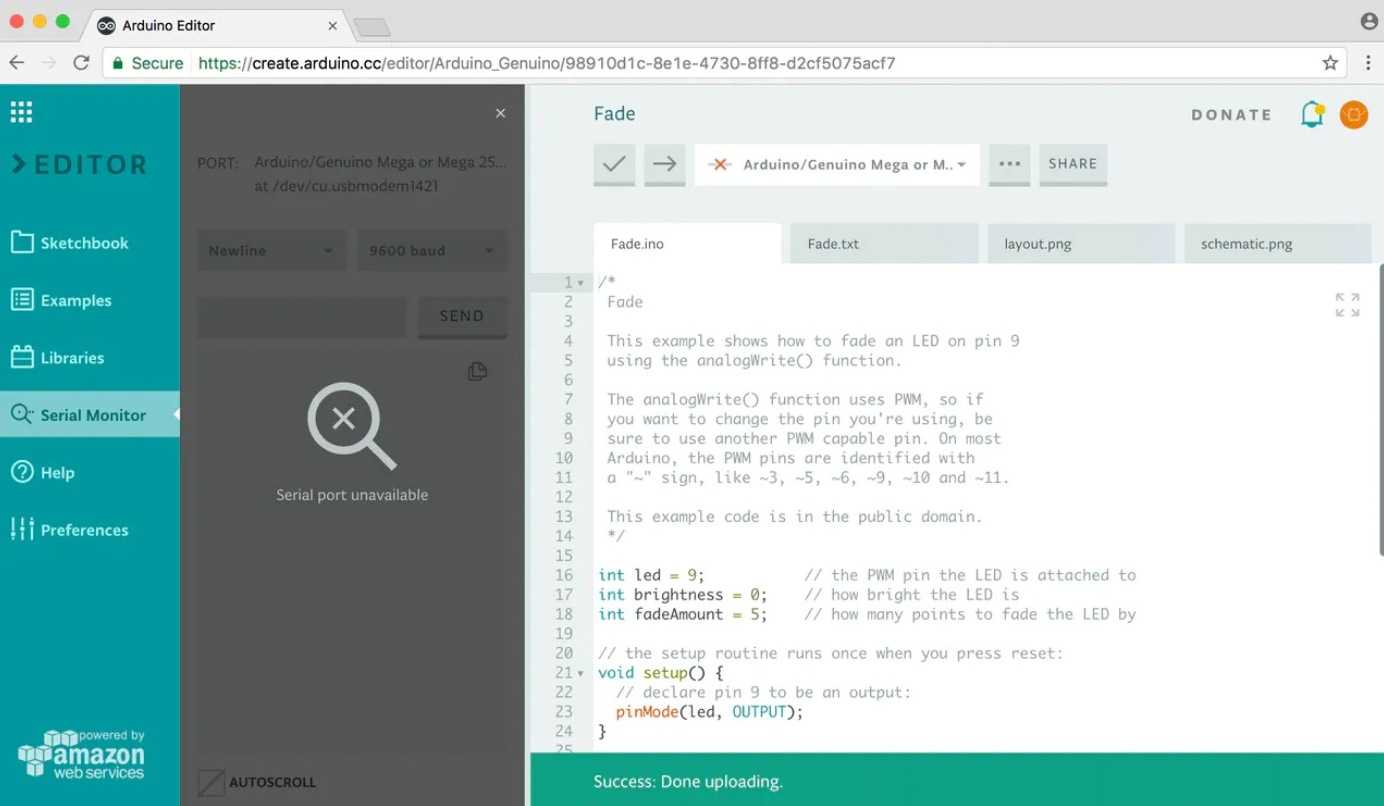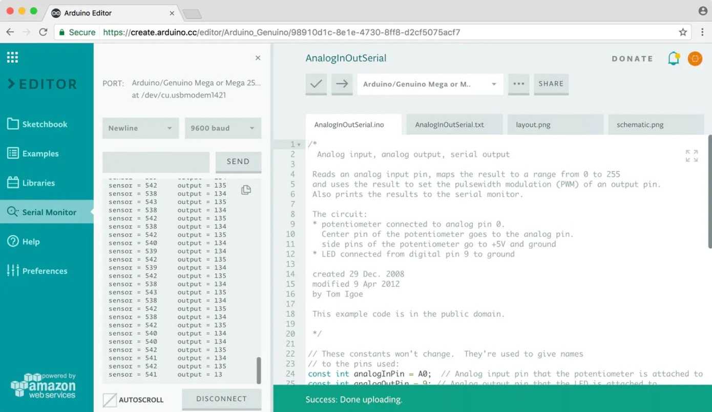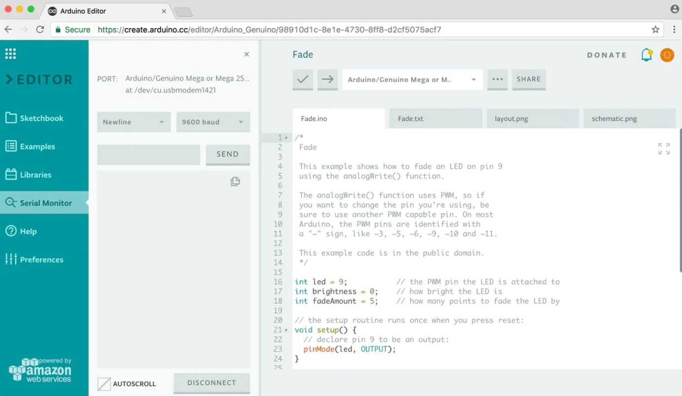 В Arduino Web Editor монитор последовательной связи Serial Monitor доступен в боковой панели.
