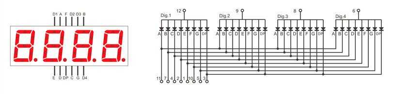 На следующем рисунке показана внутренняя схема соединений 4-х разрядного семисегментного дисплея.