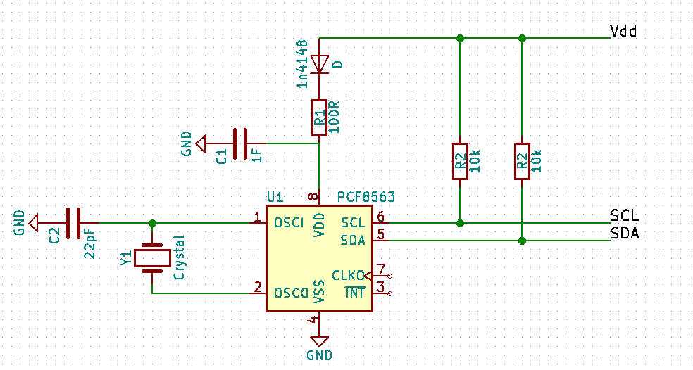 Примечание.Напряжение питания проходит через диод, чтобы предотвратить разряд конденсатора; Если вы используете обычный диод (например, 1n4148), напряжение Vdd, питающее PCF, упадет примерно на 0,6 — 0,7 В (диод будет «потреблять» его); для меньшего падения вы можете использовать, например, диод Шоттки.