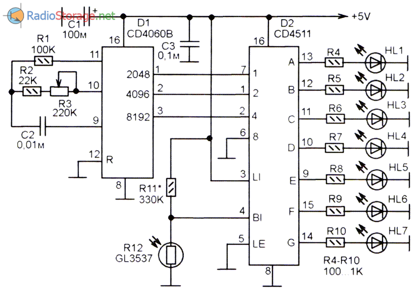 Микросхема D1 CD4060B, микросхема, состоящая из 14-разрядного двоичного счетчика и мультивибратора. Внешними элементами мультивибратора является RC-цепь C2-R2-R3-R1.