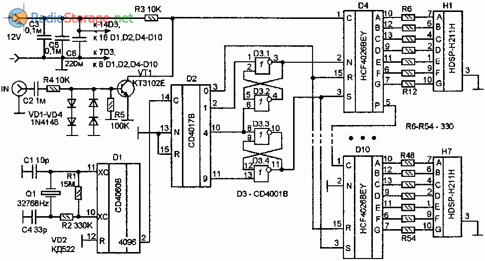 При делении его частоты на 8192 (снята с выхода с весовым коэффициентом 4096) на выводе 2 D1 получается частота 4 Гц. Эта частота поступает на схему управления, состоящую из десятичного счетчика D2 и двух RS-триггеров на микросхеме D3.
