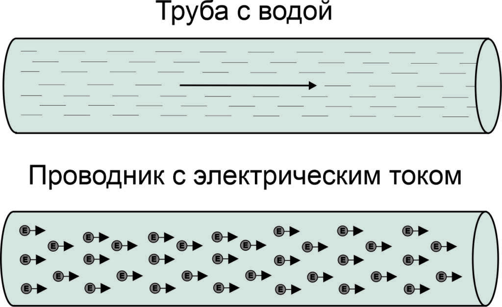По аналогии поток электронов, то есть электрический ток, можно описать такими характеристиками как электрическое напряжение (давление для воды) и сила тока (объём потока воды). Электрический проводник по аналогии с трубой можно описать таким свойством как сопротивление электрическому току (сопротивление потоку воды).