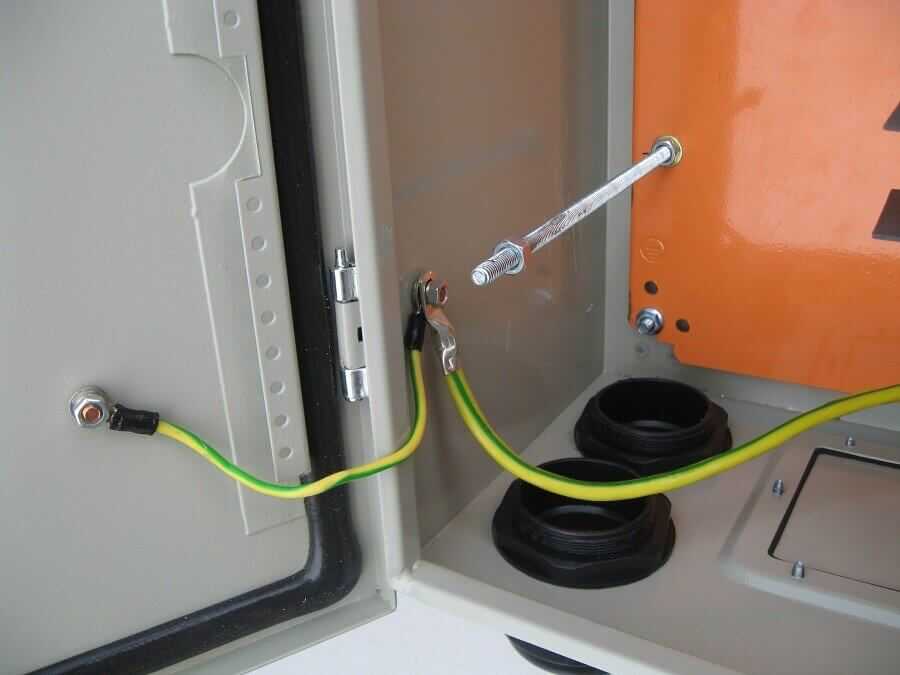 К щиту медный провод крепится на корпус также винтовым соединением. Если дверца щита не заземлена, то заземлите её еще одним проводом.
