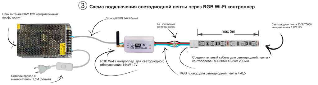 Схема подключения светодиодной ленты RGB длиной 5м или 10м