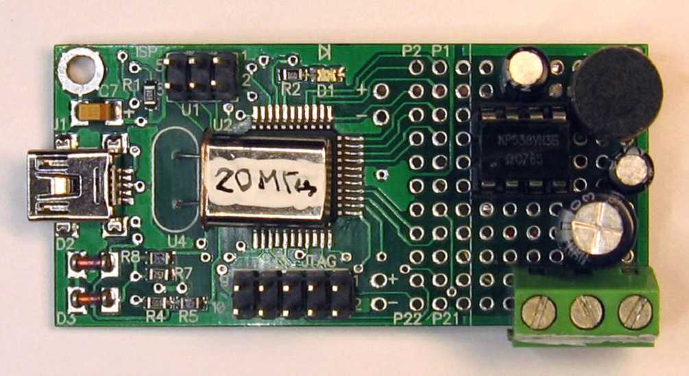 Также нам может понадобиться макетная плата для подключения USB. Самым популярным, дешевым, но при этом функциональным вариантом для подключения является модель AVR-USB-MEGA16 под USB 1.1. Эта версия USB считается уже несколько устаревшей т.к. передает сигнал к светодиодам со скоростью 8 миллисекунд, что для современной техники слишком медленно, но, поскольку человеческий глаз и эту скорость воспринимает как «мгновение ока», то нам она вполне подойдет.