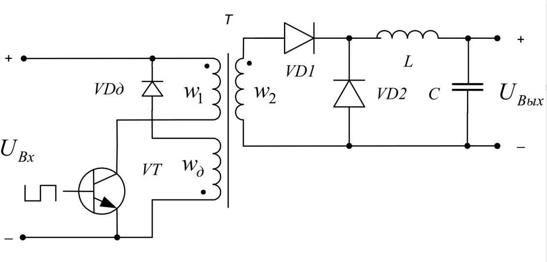 Вот одна из таких схем, содержащих трансформатор. Энергия, которая накапливается в магнитном поле первичной обмотки трансформатора, в нагрузку выводится через вторичную обмотку. Трансформатор в этом случае может быть и повышающим и понижающим. Применяется очень часто в сетевых источниках где есть необходимость снижения входного напряжения от нескольких сотен вольт до единиц или десятков.