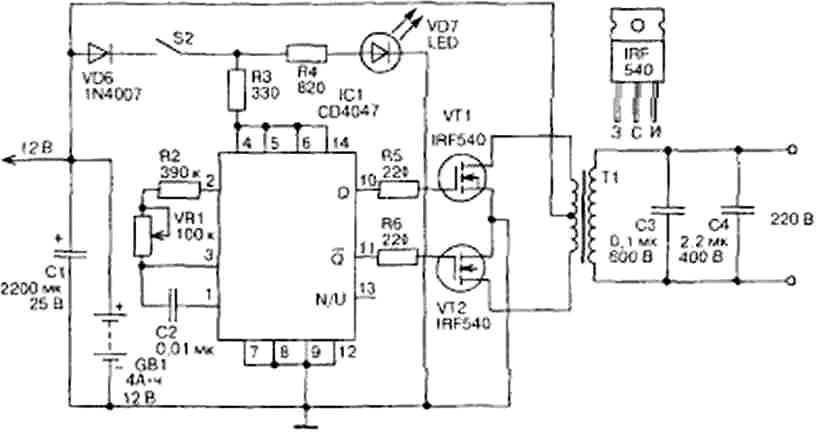 Конденсатор C1 фильтрует напряжение питания. Выходной фильтр представляет собой конденсатор C4, а стабилитрон VD3 мощностью 1,3 Вт защищает схему от возможного кратковременного повышения напряжения.