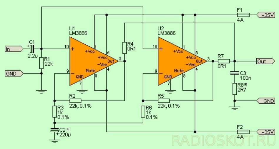 Даже многочисленные коммерческие УМЗЧ использовались с параллельной парой LM3886. Но это совсем не дело. Даже очень небольшое смещение постоянного или переменного тока вызывает сильный ток между встроенными выходными контактами. Большинство схем рекомендует 0,1 Ом, но если разница между выходами двух усилителей составляет 1 В, это означает что ток равен уже 5 А.