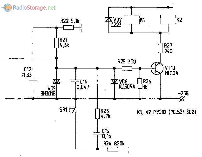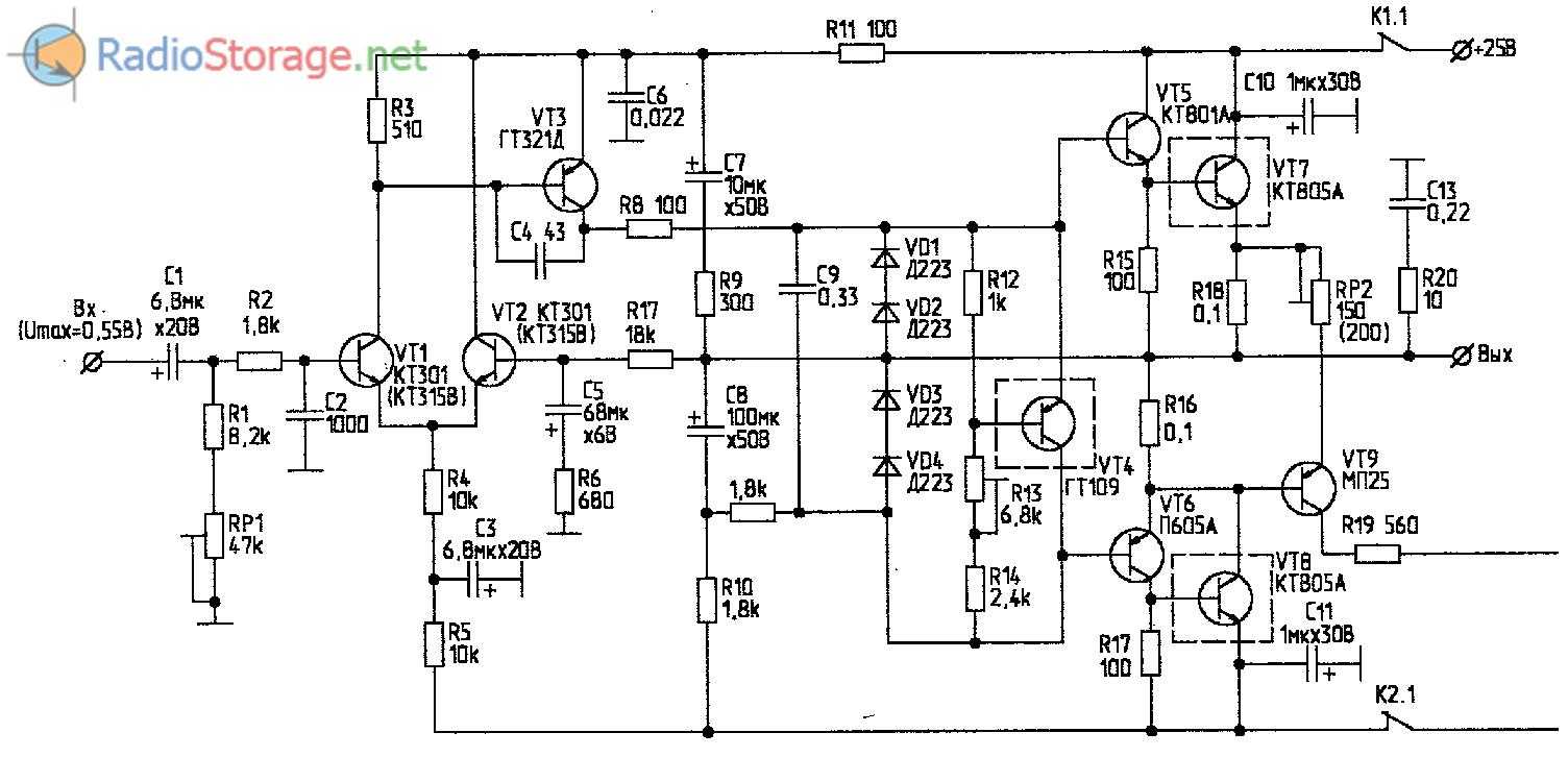 При превышении его заданной величины срабатывает триггер на туннельном диоде VD5, и реле К1, К2 отключают питание усилителя. Кнопка SB1 сбрасывает триггер в исходное состояние.