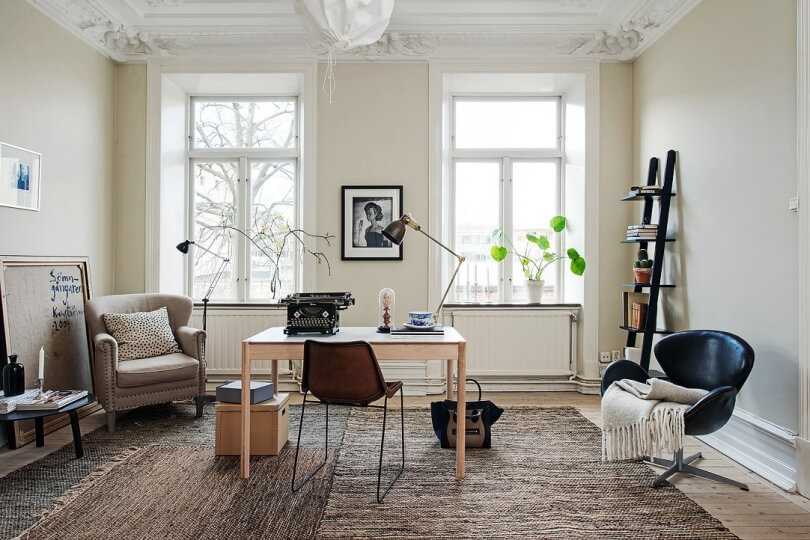 Важно при оформлении зоны для работы и то, как будет установлен светильник. В данном случае лампа не должна выглядывать из-под абажура или находиться на уровне глаз