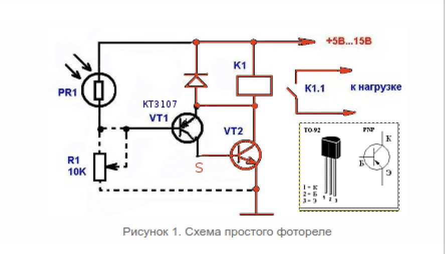 Слегка переделав схему и дополнив ее одним транзистором и солнечным фотоэлементом от старого калькулятора, был собран прототип сумеречного выключателя — самодельное фотореле на транзисторе. При освещении солнечного элемента PR1, транзистор VT1 открывается и подает сигнал на выходной релейный модуль, который переключает свои контакты, управляя полезной нагрузкой.