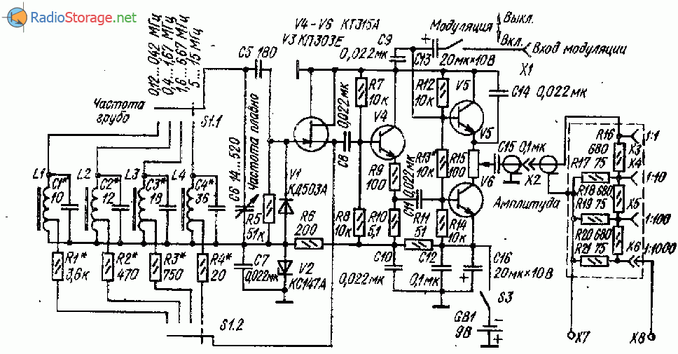 2. Погрешность установки ВЧ не более ±5%. 3. Генератор ВЧ обеспечивает плавную регулировку выходного напряжения от 0,05 мВ до 0,1 В. 4. Генератор обеспечивает следующие виды работ: а) непрерывная генерация; б) внутренняя амплитудная модуляция синусоидальным напряжением с частотой 1кГц. 5. Глубина модуляции не менее 30%. 6. Выходное сопротивление ВЧ генератора не более 200 Ом. 7. НЧ генератор генерирует 5 фиксированных частот: 100 Гц, 500 Гц, 1кГц, 5кГц, 15кГц. 8. Допустимое отклонение частоты НЧ генератора не более ±10%. 9. Выходное сопротивление НЧ генератора не более 600 Ом. 10. Выходное напряжение НЧ плавно регулируется от 0 до 0.5 В. 11. Время самопрогрева прибора — 10 минут. 12. Питание прибора осуществляется от батареи «Крона» напряжением 9 В.